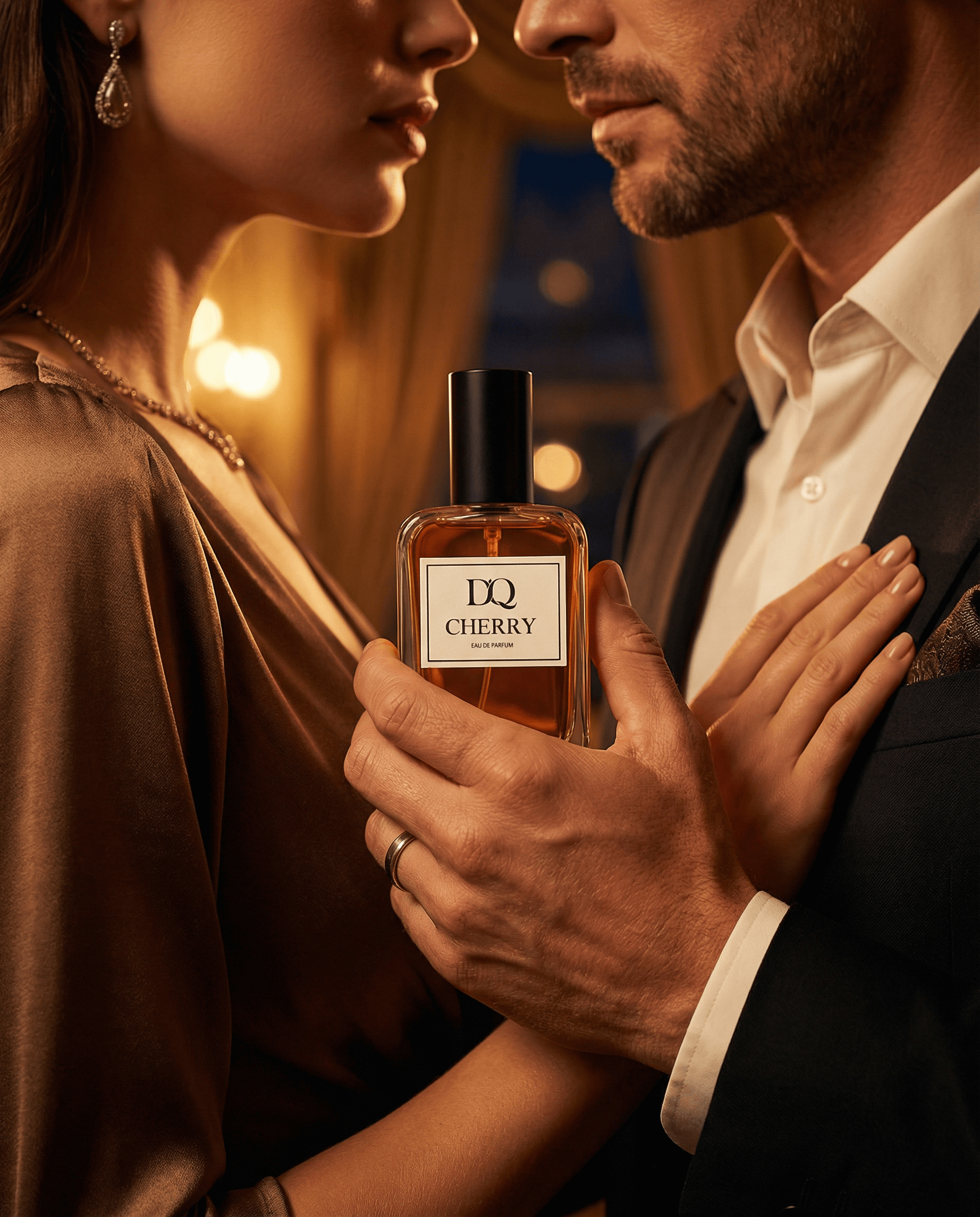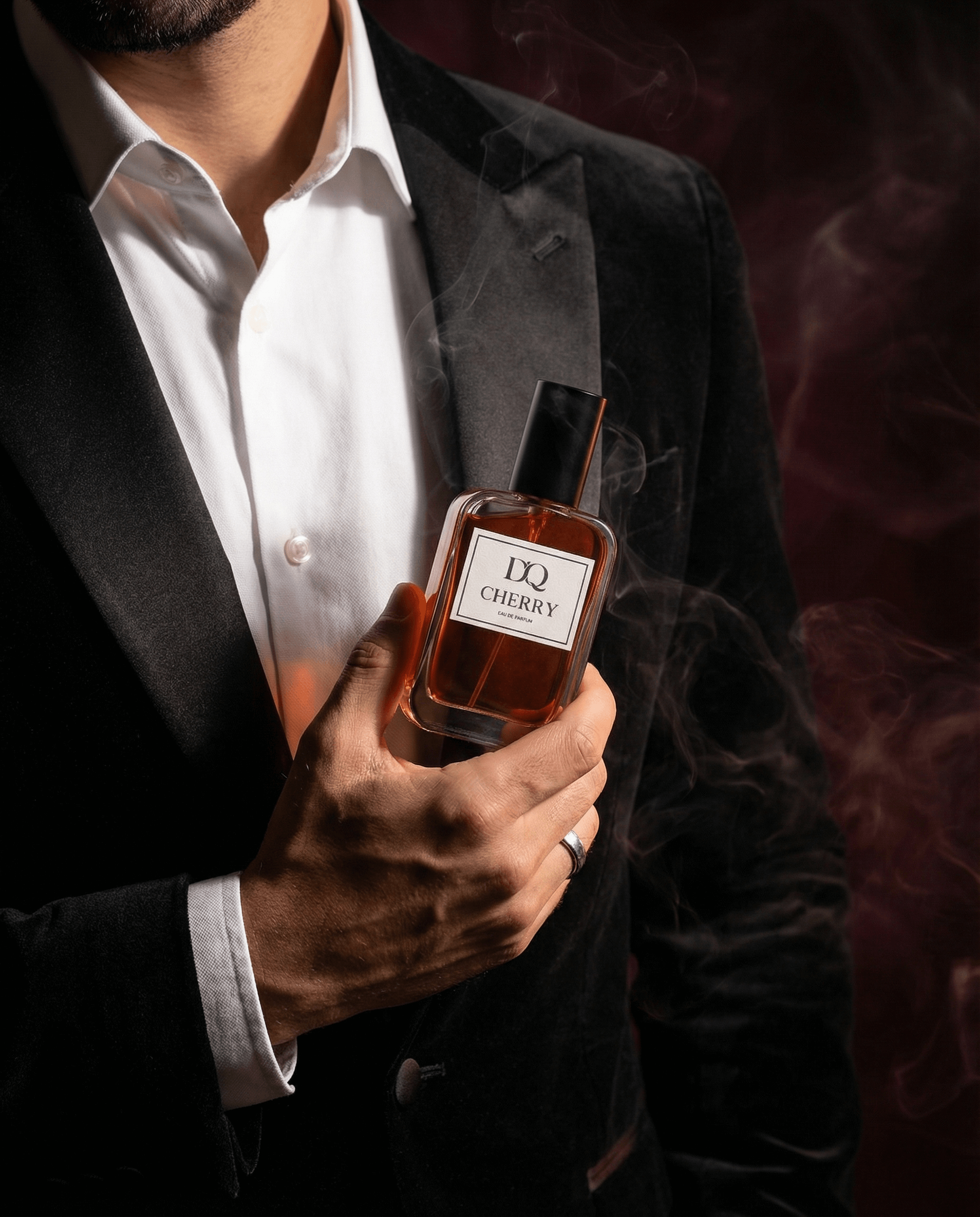 D'QAR CHERRY . Ce parfum exquis s'ouvre sur un accord vibrant de cerise acidulée, d'amande amère et d'une touche de précieux safran. Son cœur révèle une composition raffinée de cuir riche, d'olive délicate, d'absolue d'osmanthus de Chine et d'abricot juteux . Les notes de fond confèrent à la fragrance profondeur et persistance grâce à une essence fumée et boisée, soulignée par le nagarmotha mystique.